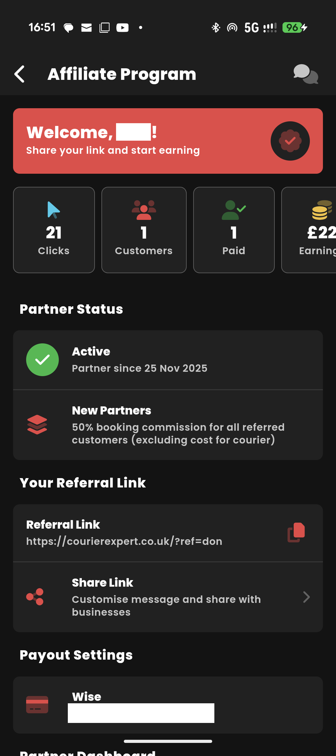 You can now earn up to 30% commission by referring businesses to Courier Expert. Know a company that needs reliable delivery services? Share your unique referral link directly from the app and earn every time they book. Head to Account > Affiliate Programme to get started.